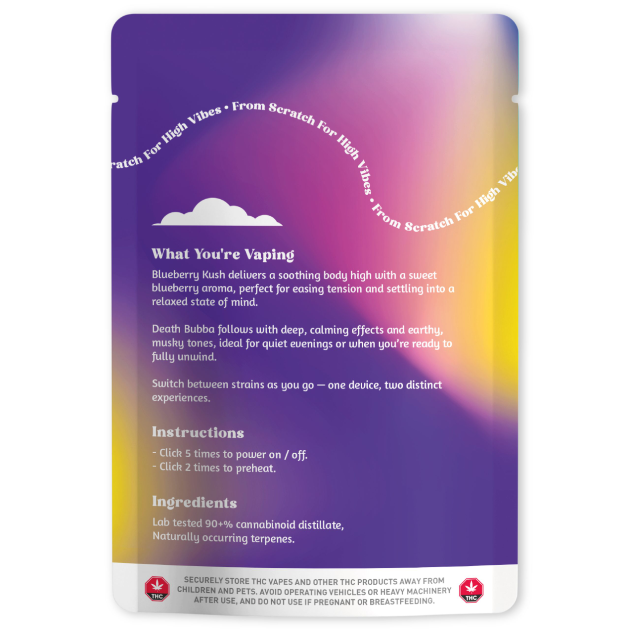 Ingredients: Lab tested 90+% cannabinoid distillate, Naturally occurring terpenes.